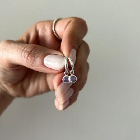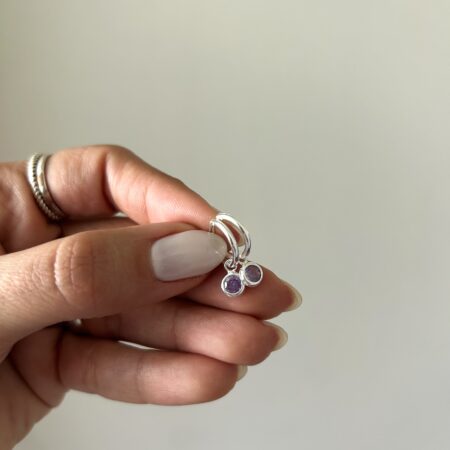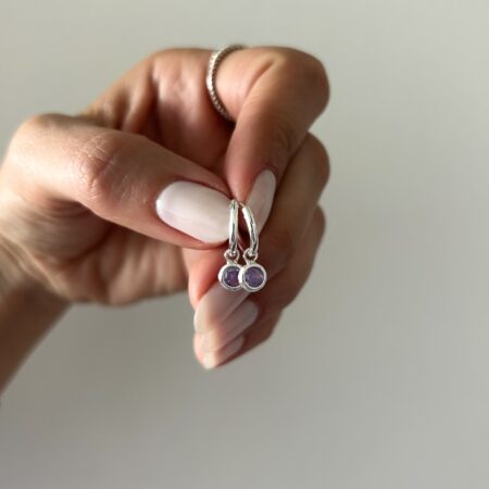 Aros con dije de circonias lila, miden 12 mm de diámetro exterior.