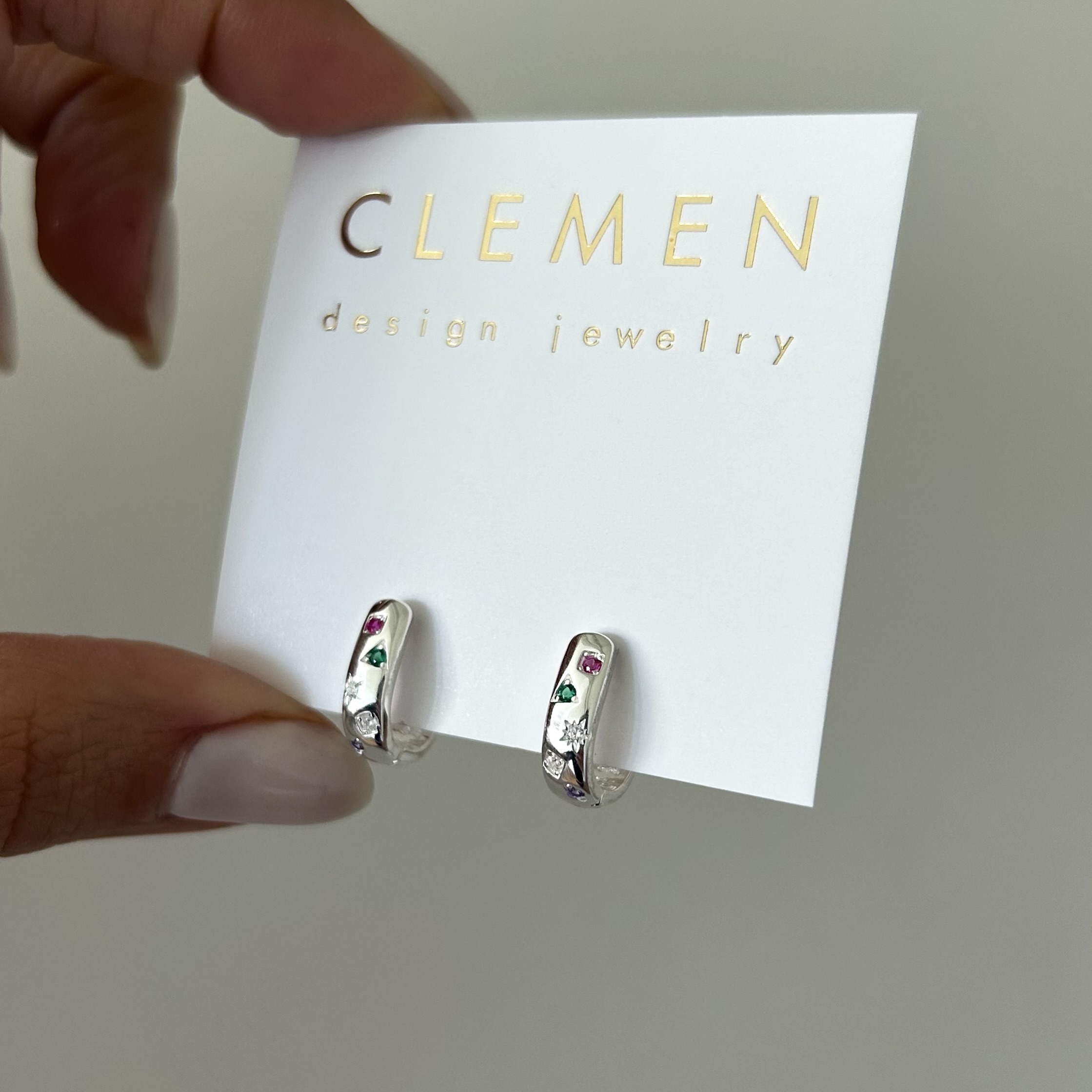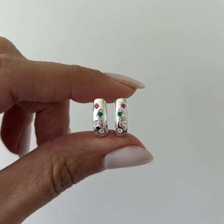 Aros gruesitos ovalados con circonias de colores, miden 13 mm de largo.