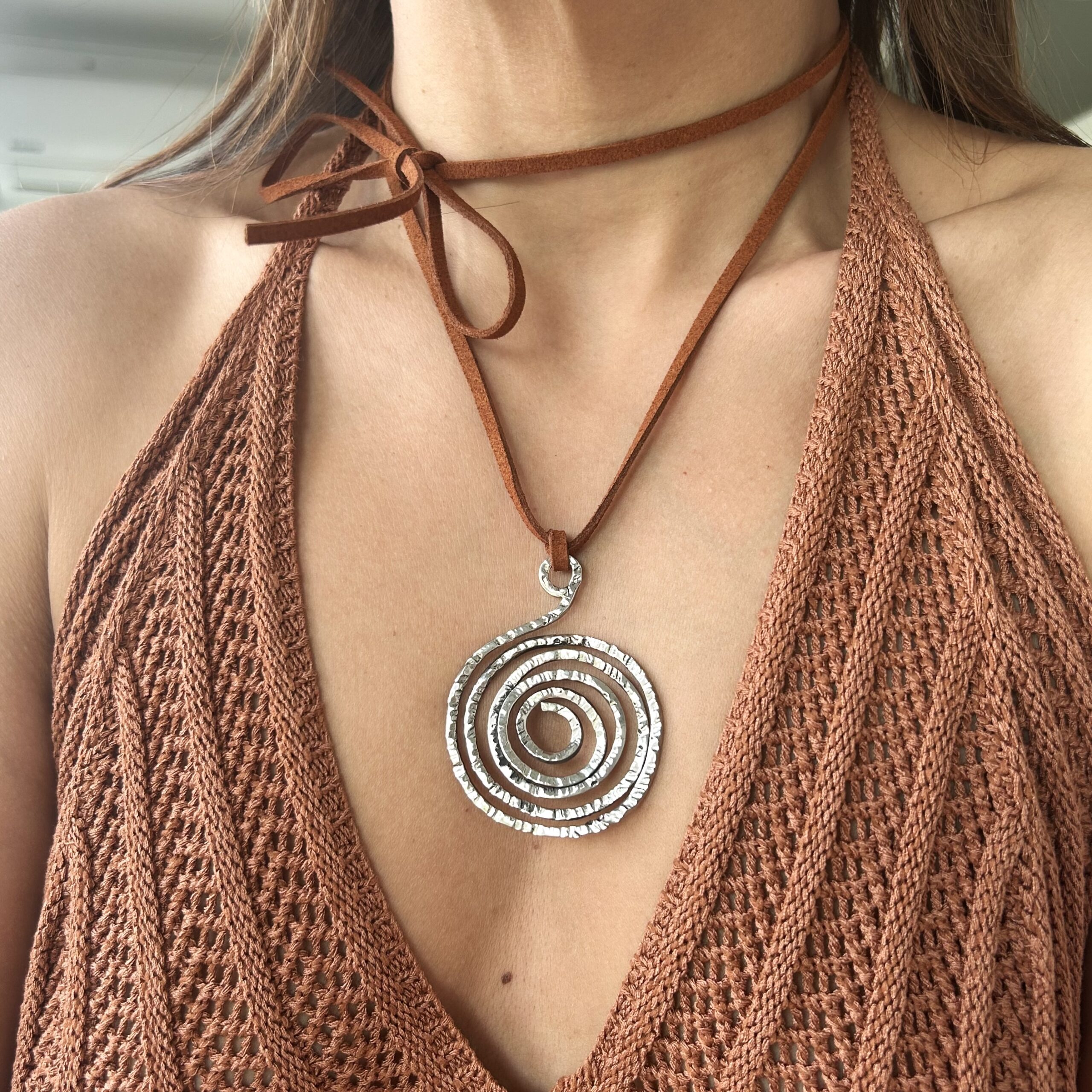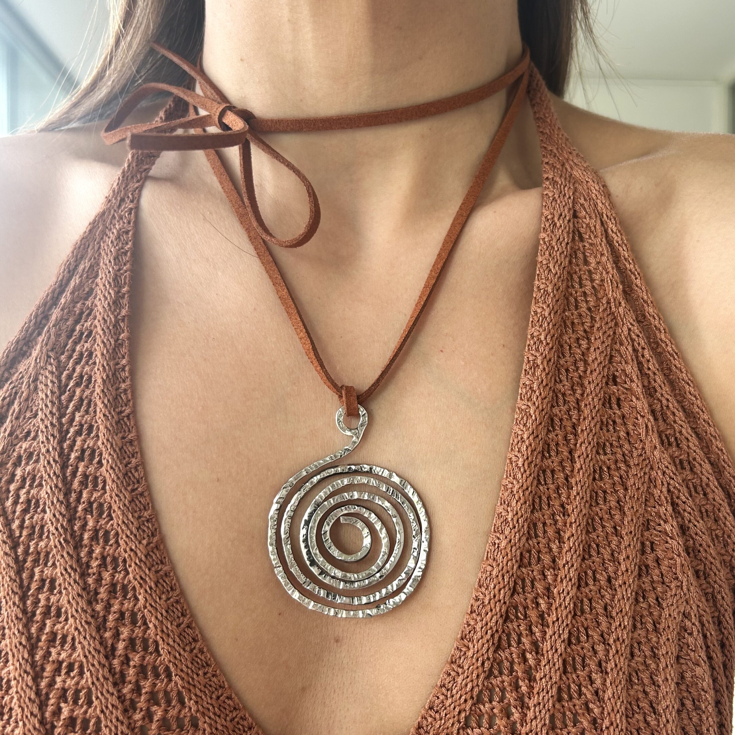 Colgante con dije en alpaca hecho a mano, y tiento de cuero.
