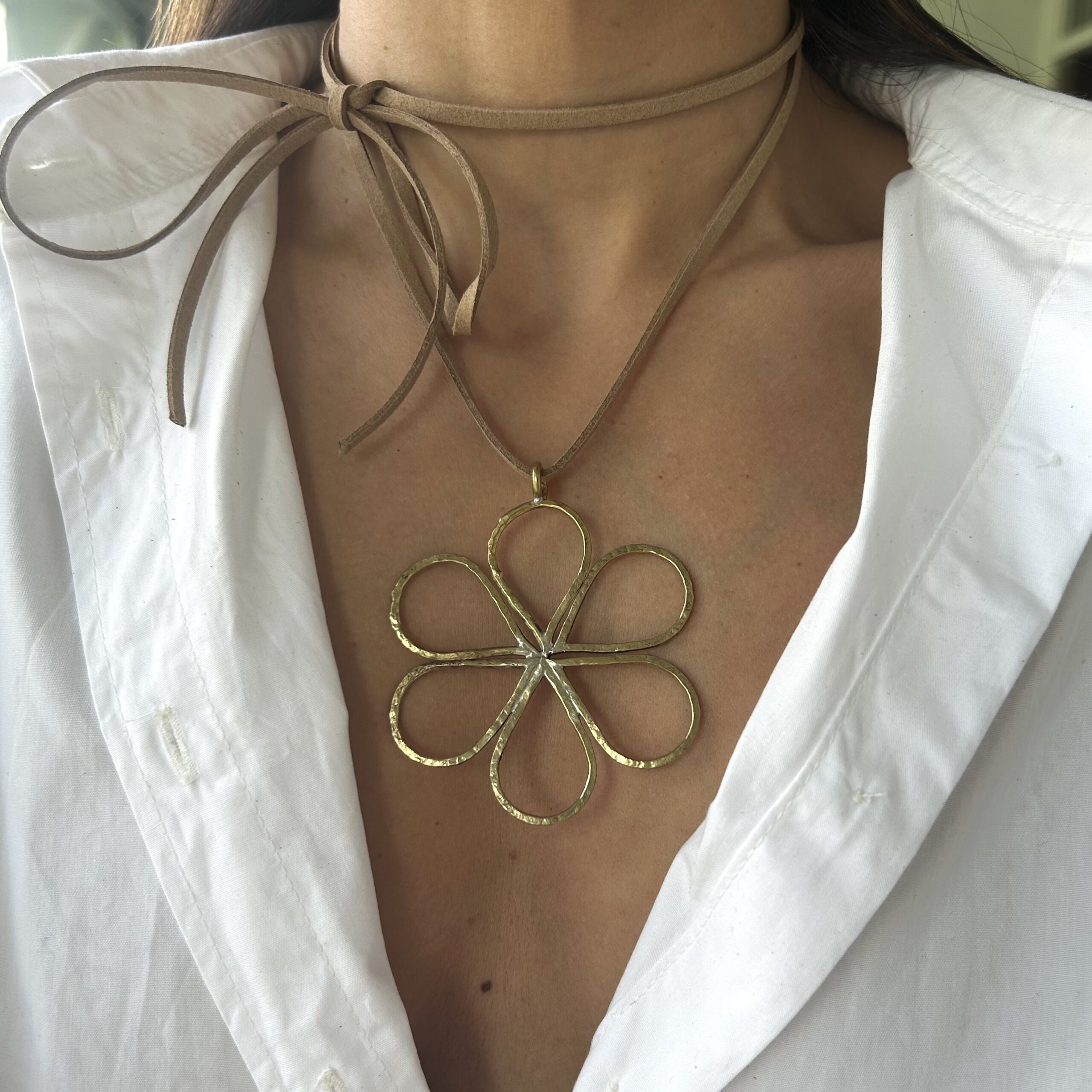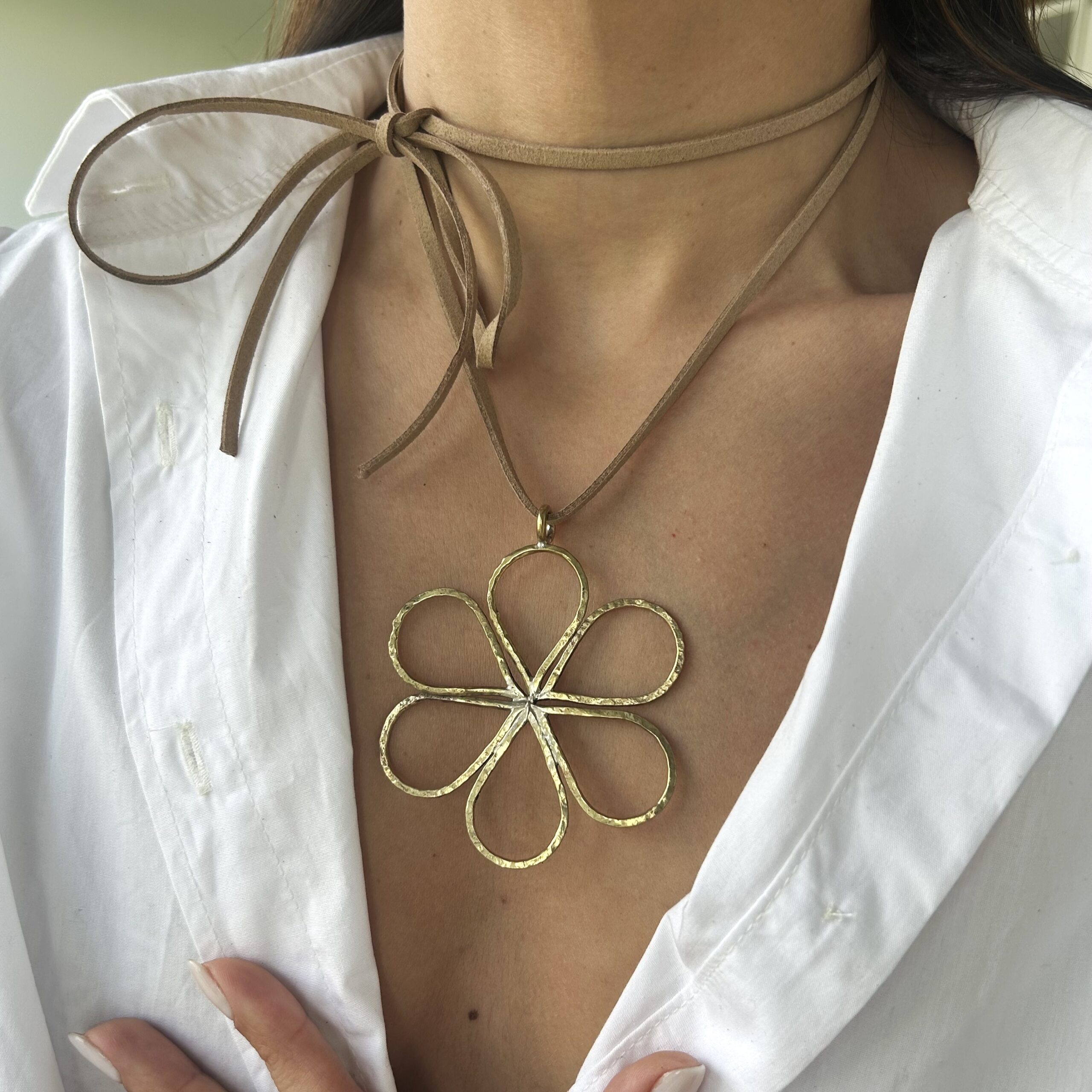 Colgante con dije en latón hecho a mano, y tiento de gamuza.