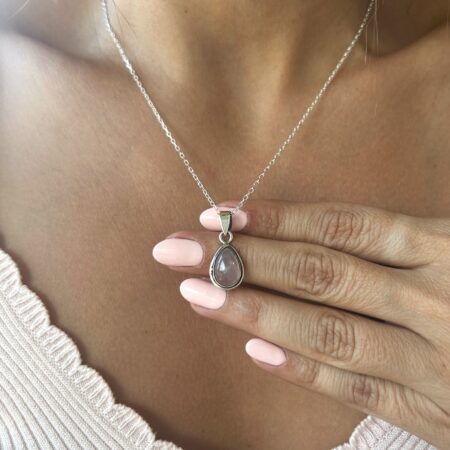 Colgante con dije lágrima de cuarzo rosa.