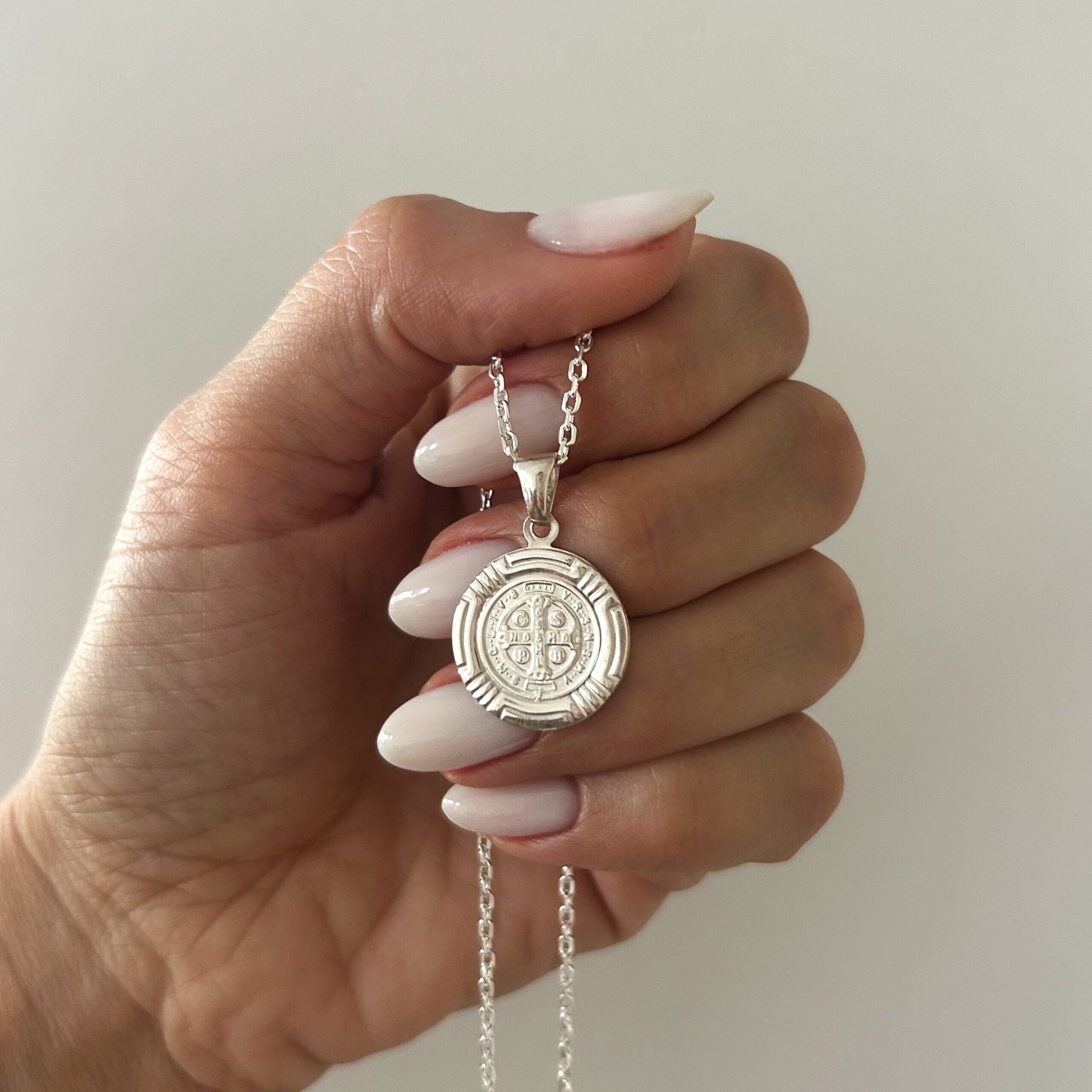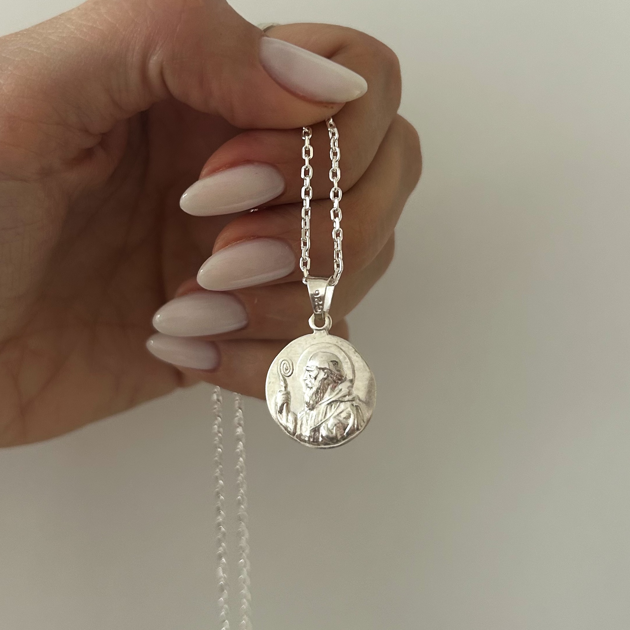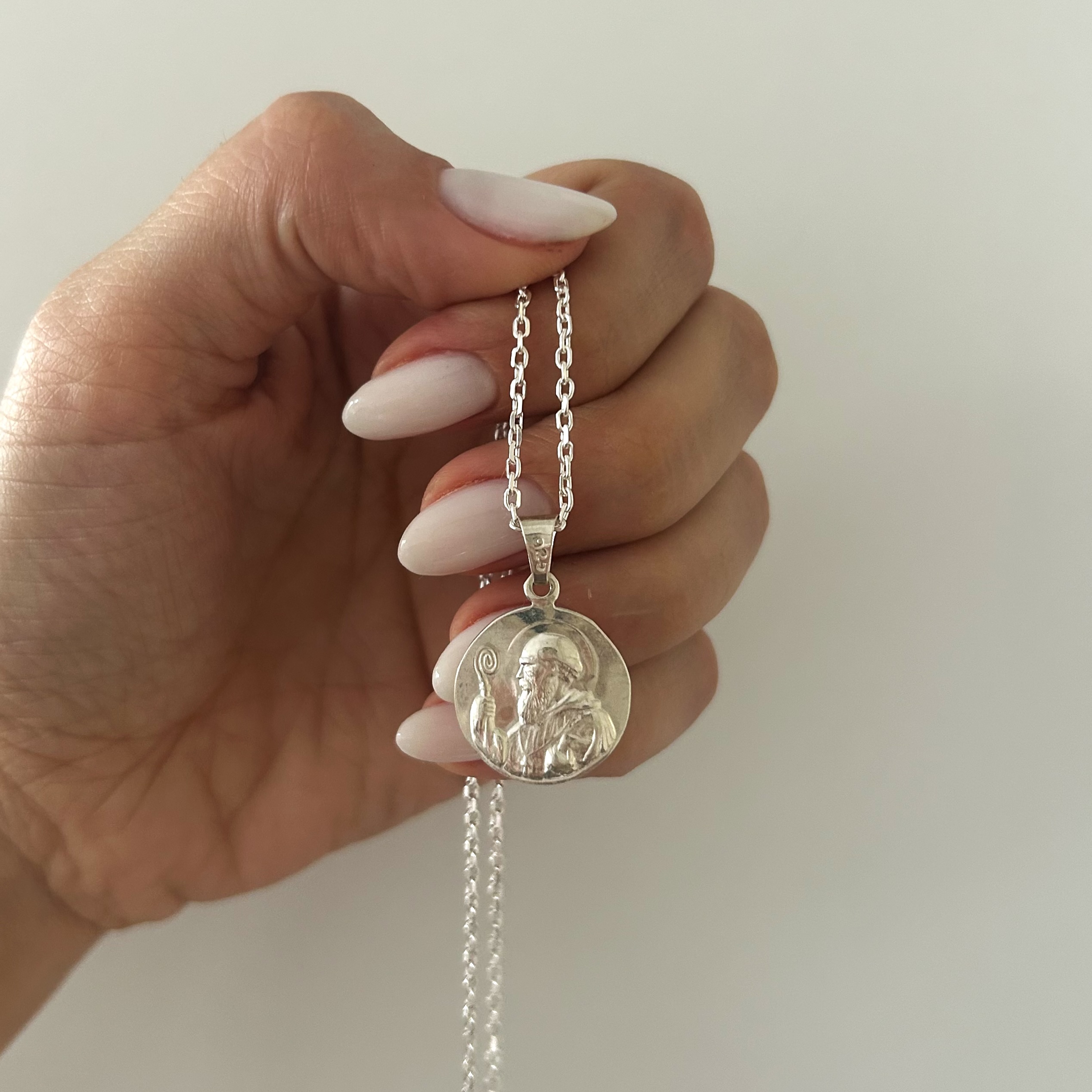 Colgante con medalla de san Benito, la medalla mide 1,8 cm de diámetro.