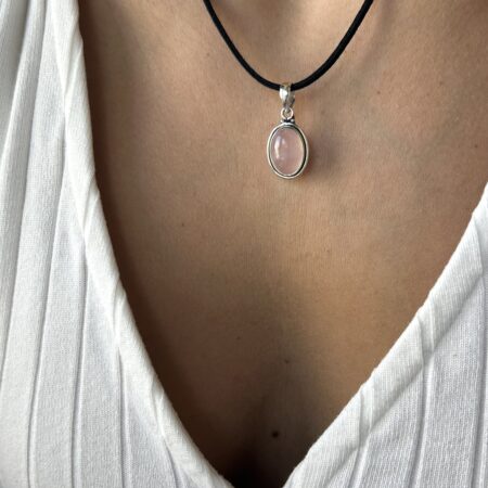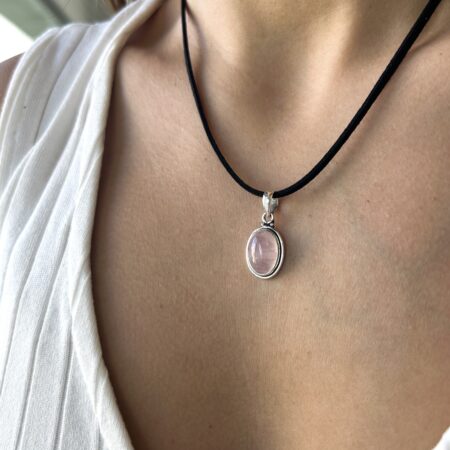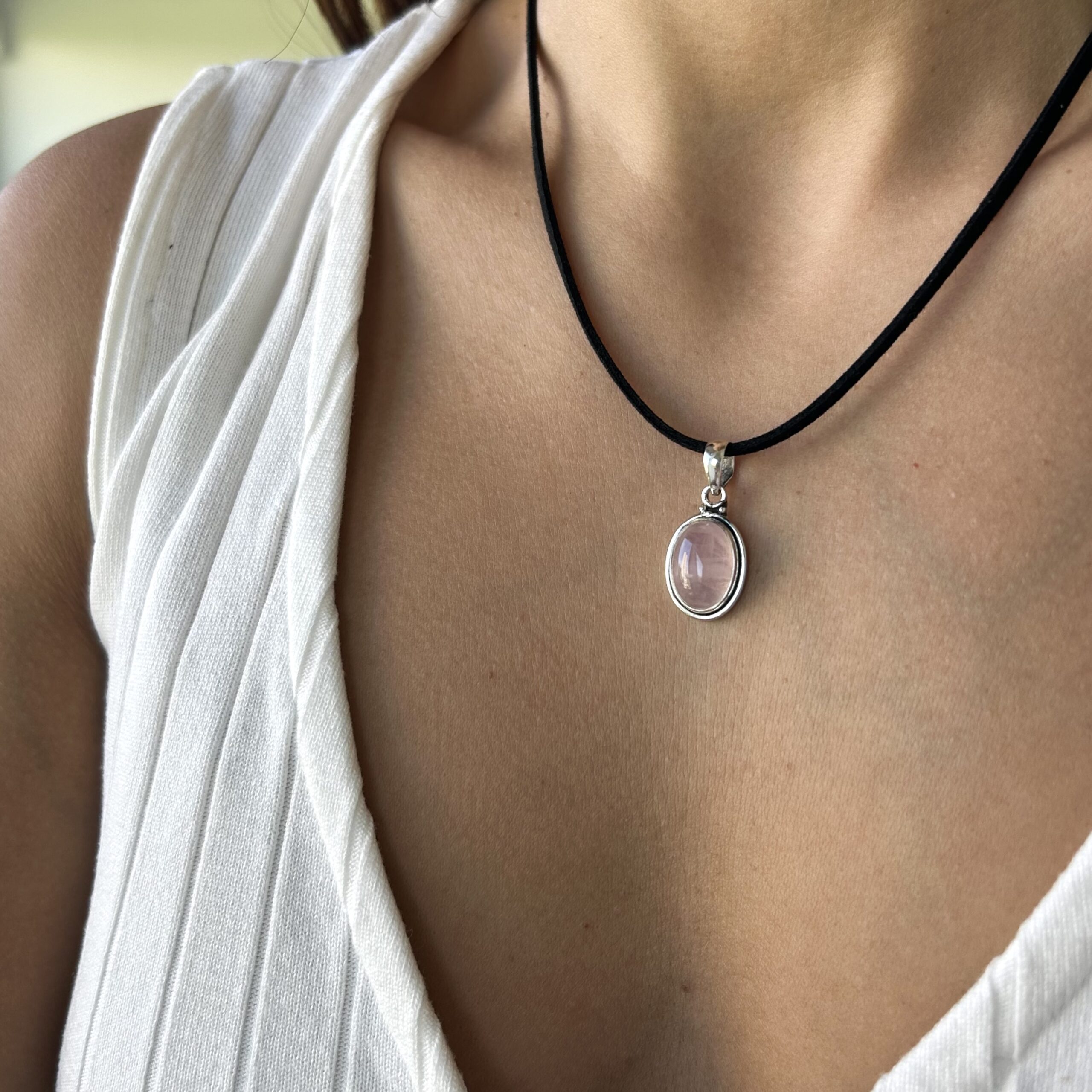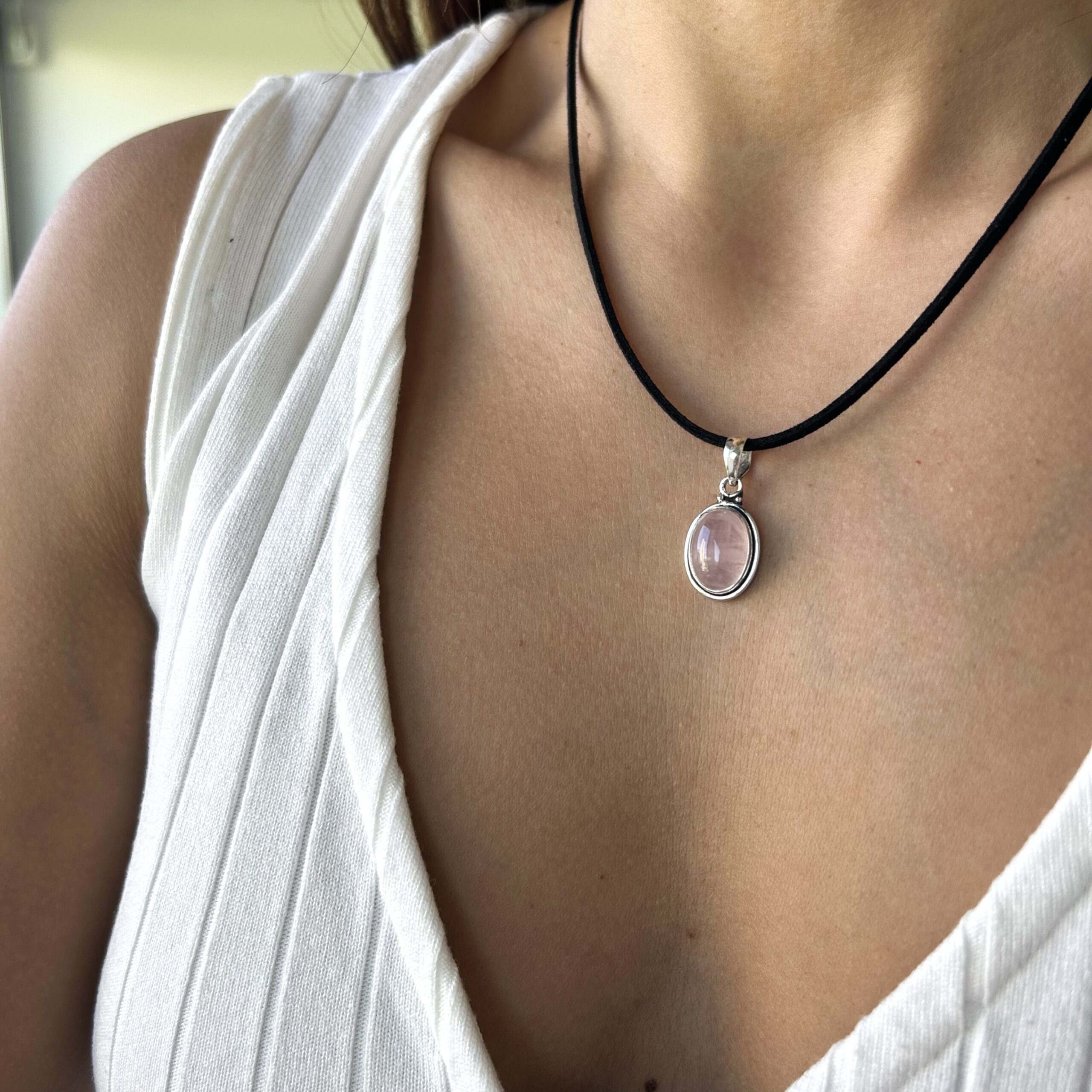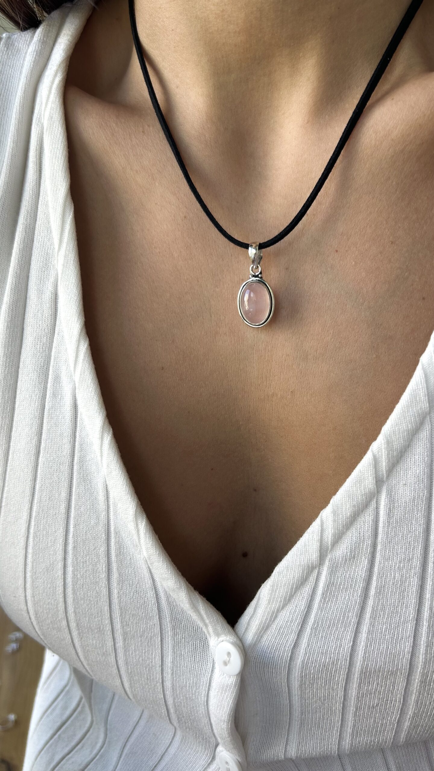 Colgante con tiento de gamuza (con terminaciones de plata 926) mas dije de piedra natural cuarzo rosa y plata 925.