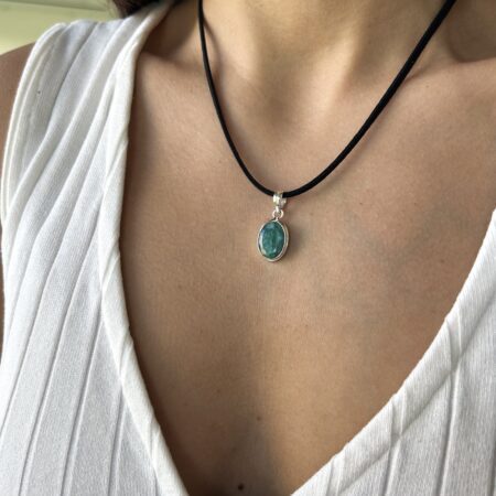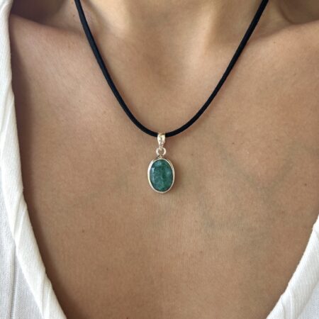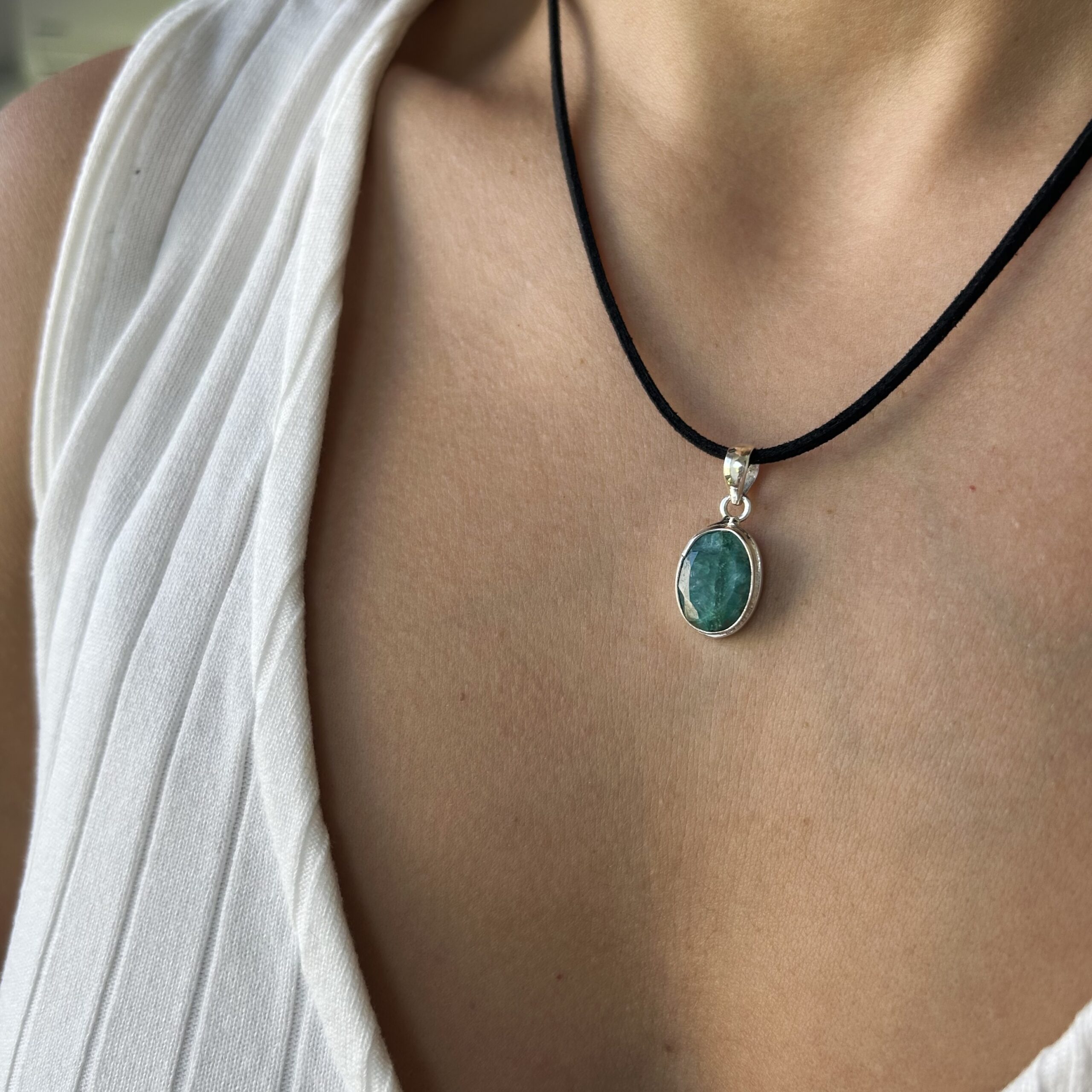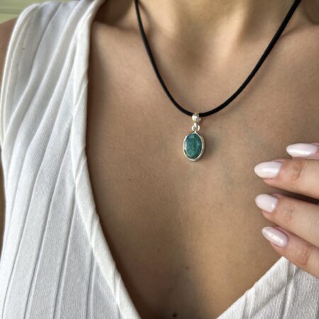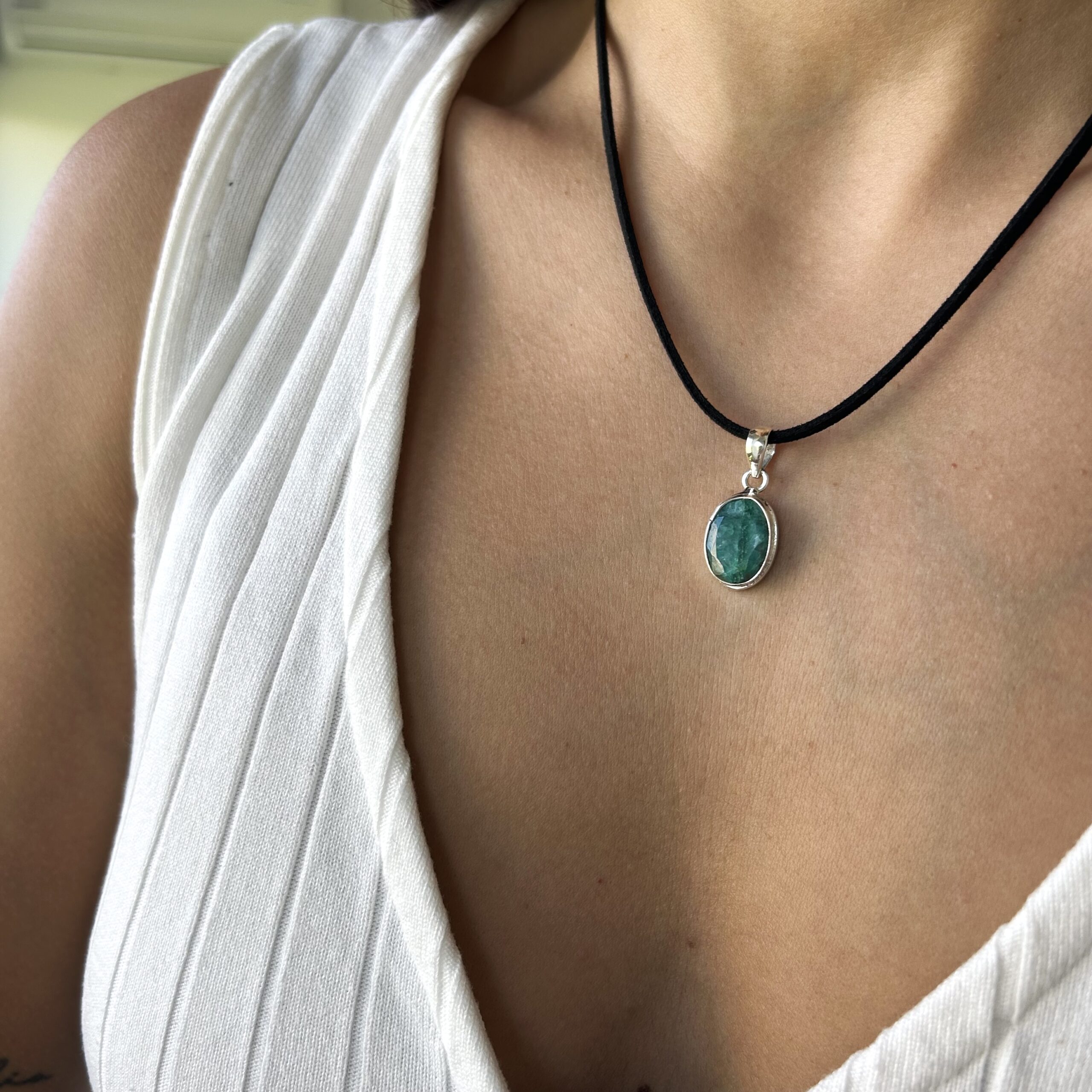 Colgante con tiento de gamuza (con terminaciones de plata 926) mas dije de piedra natural raíz de esmeralda y plata 925.