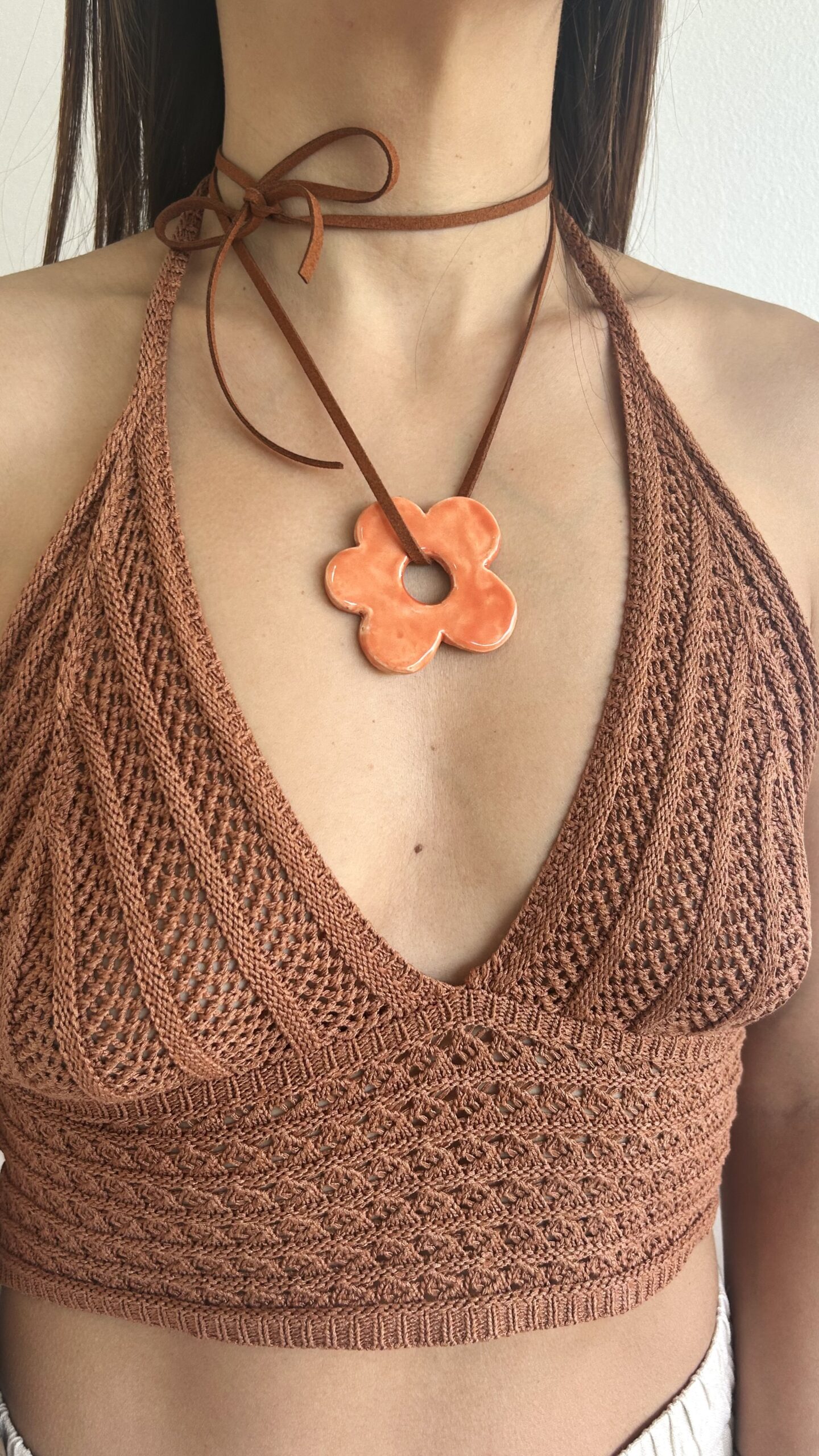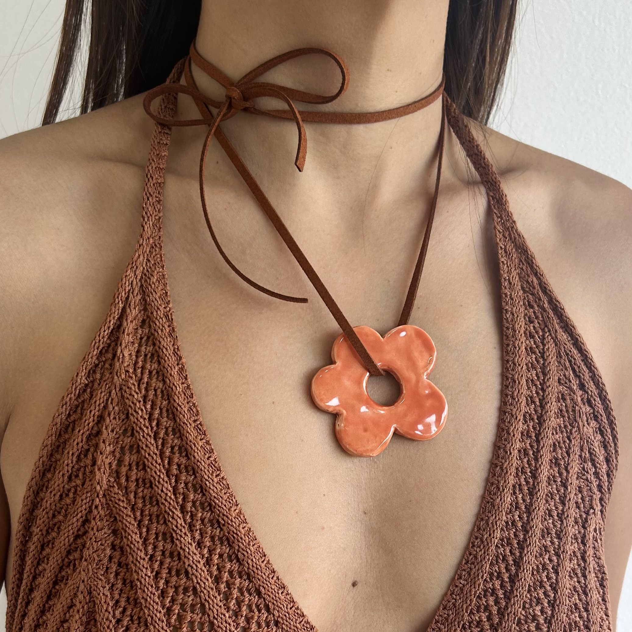 Collar de la colección de verano, la flor es de cerámica hecha a mano, el tiento es de gamuza.