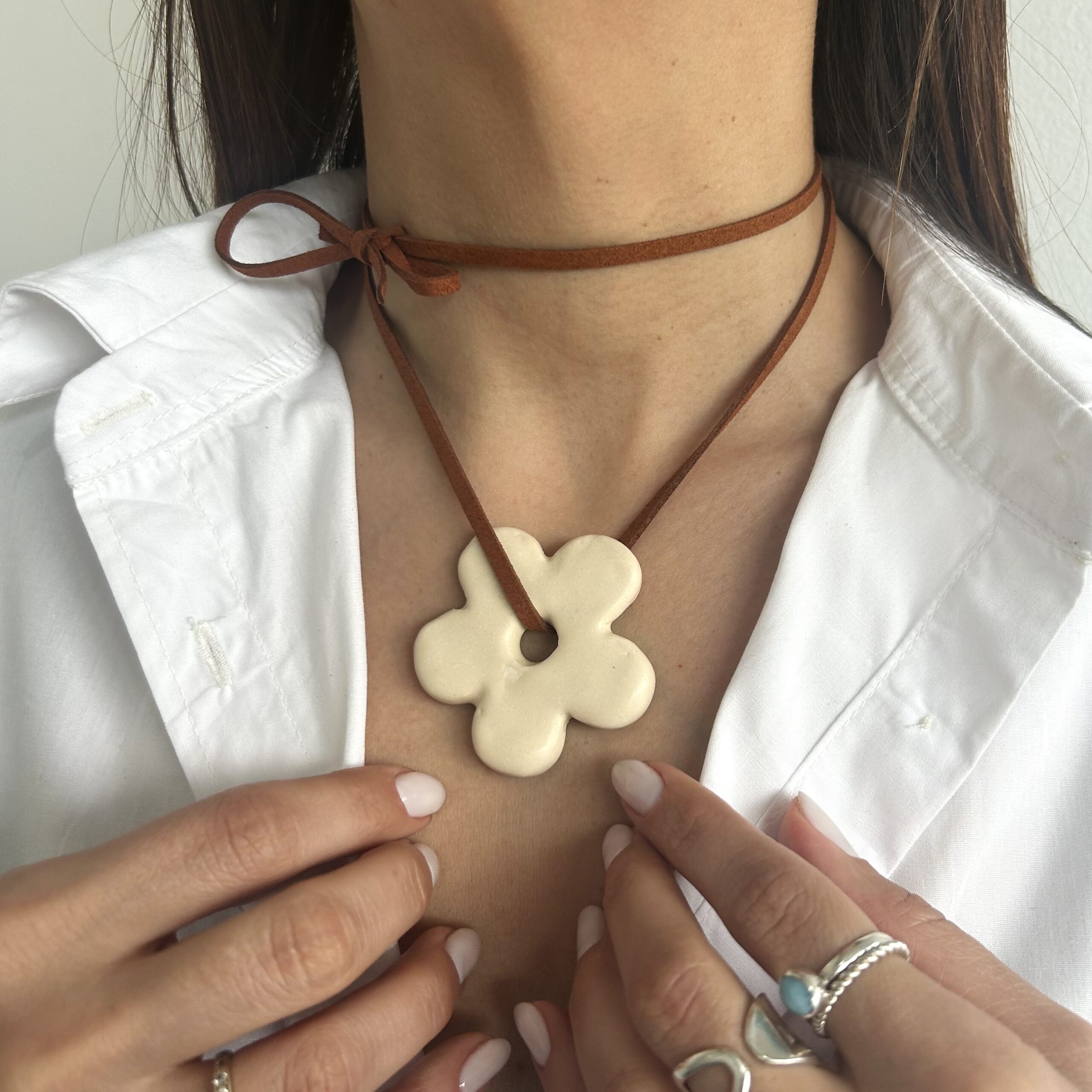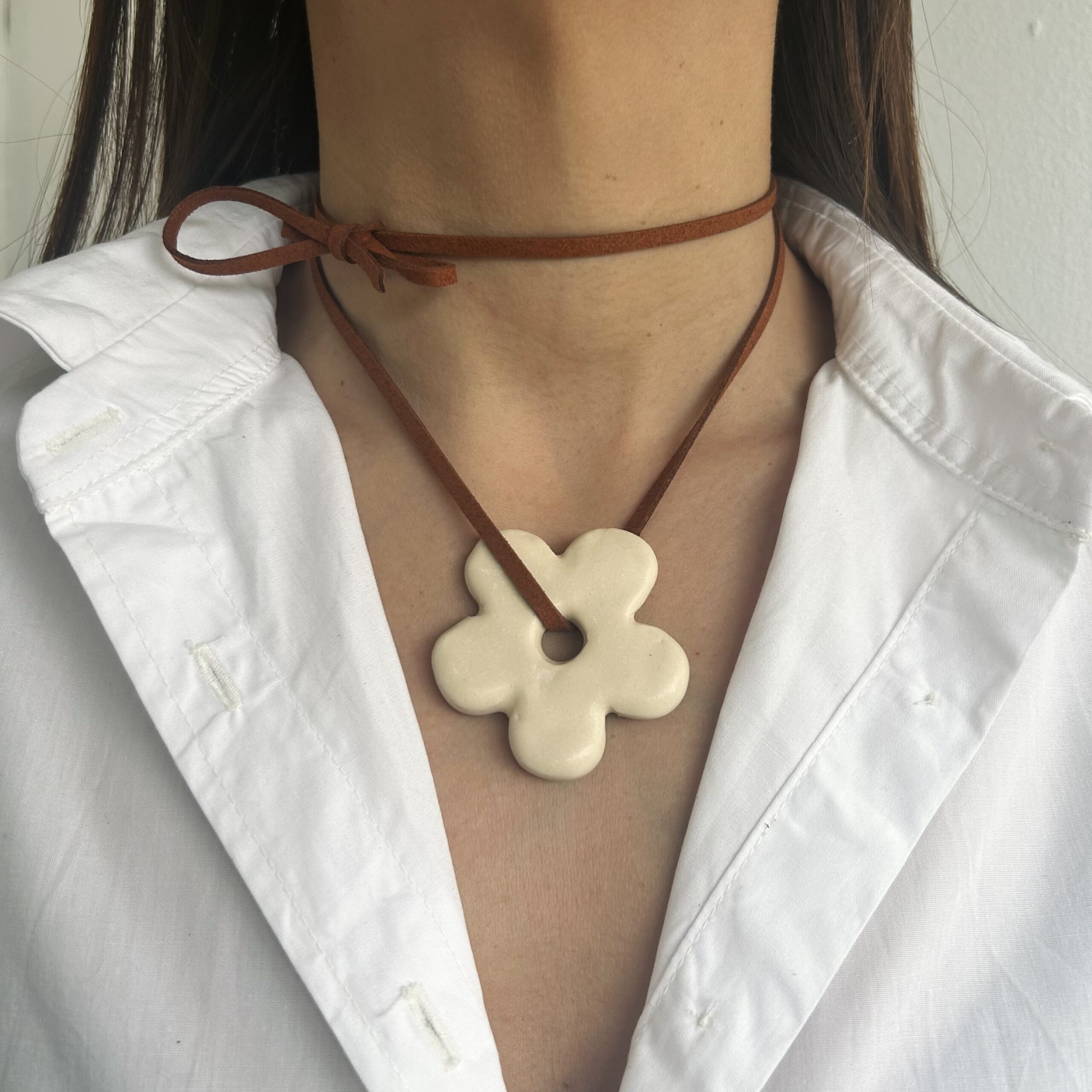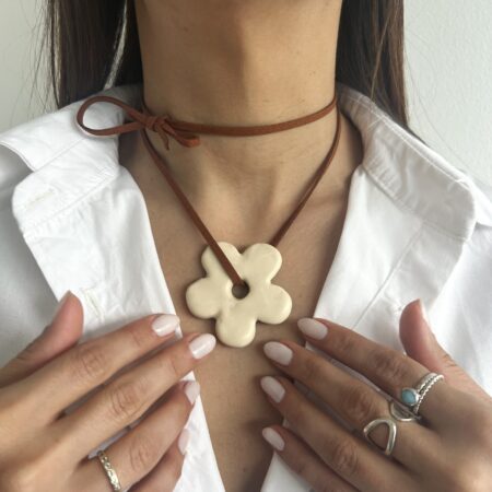 Collar de la colección de verano, la flor es de cerámica hecha a mano, el tiento es de gamuza.