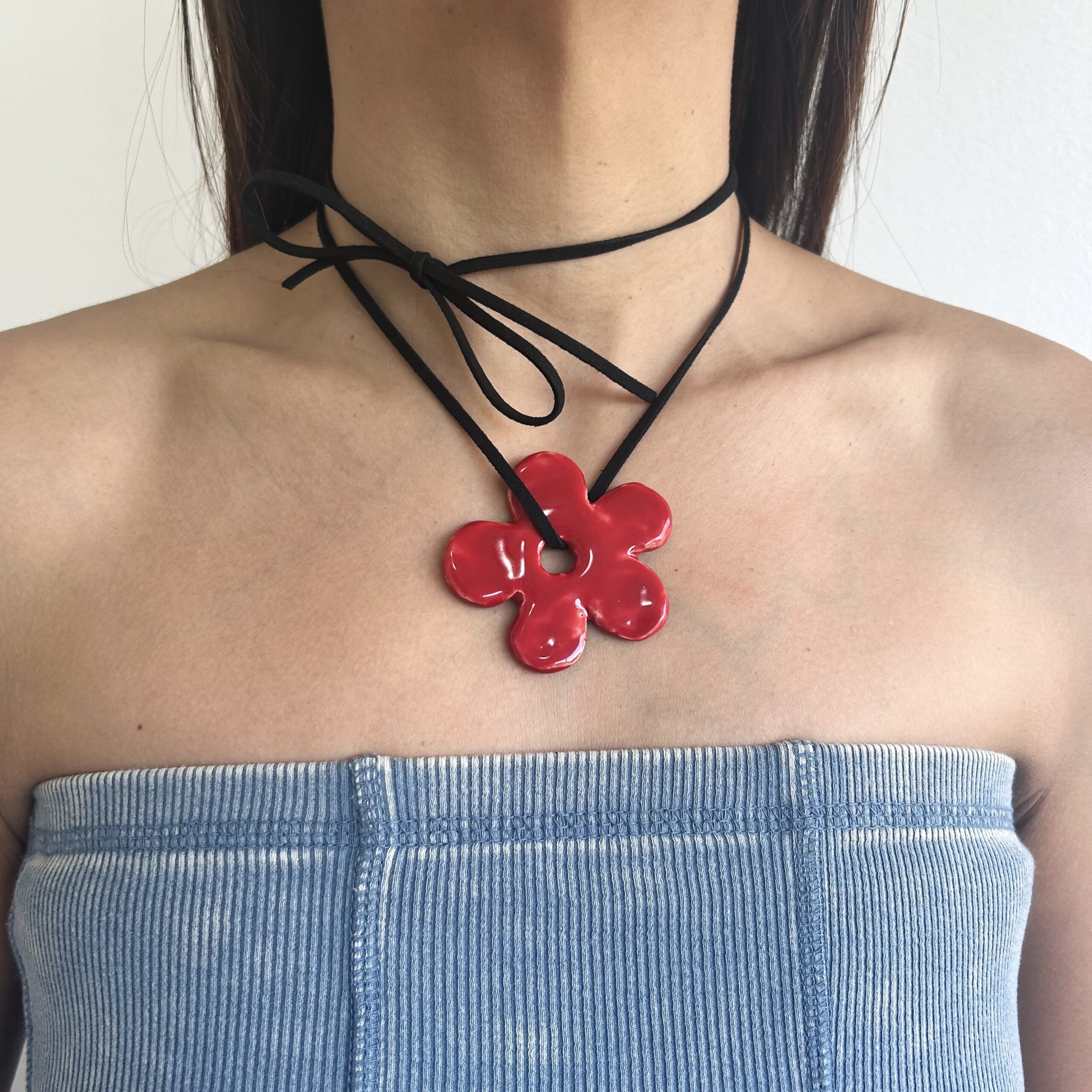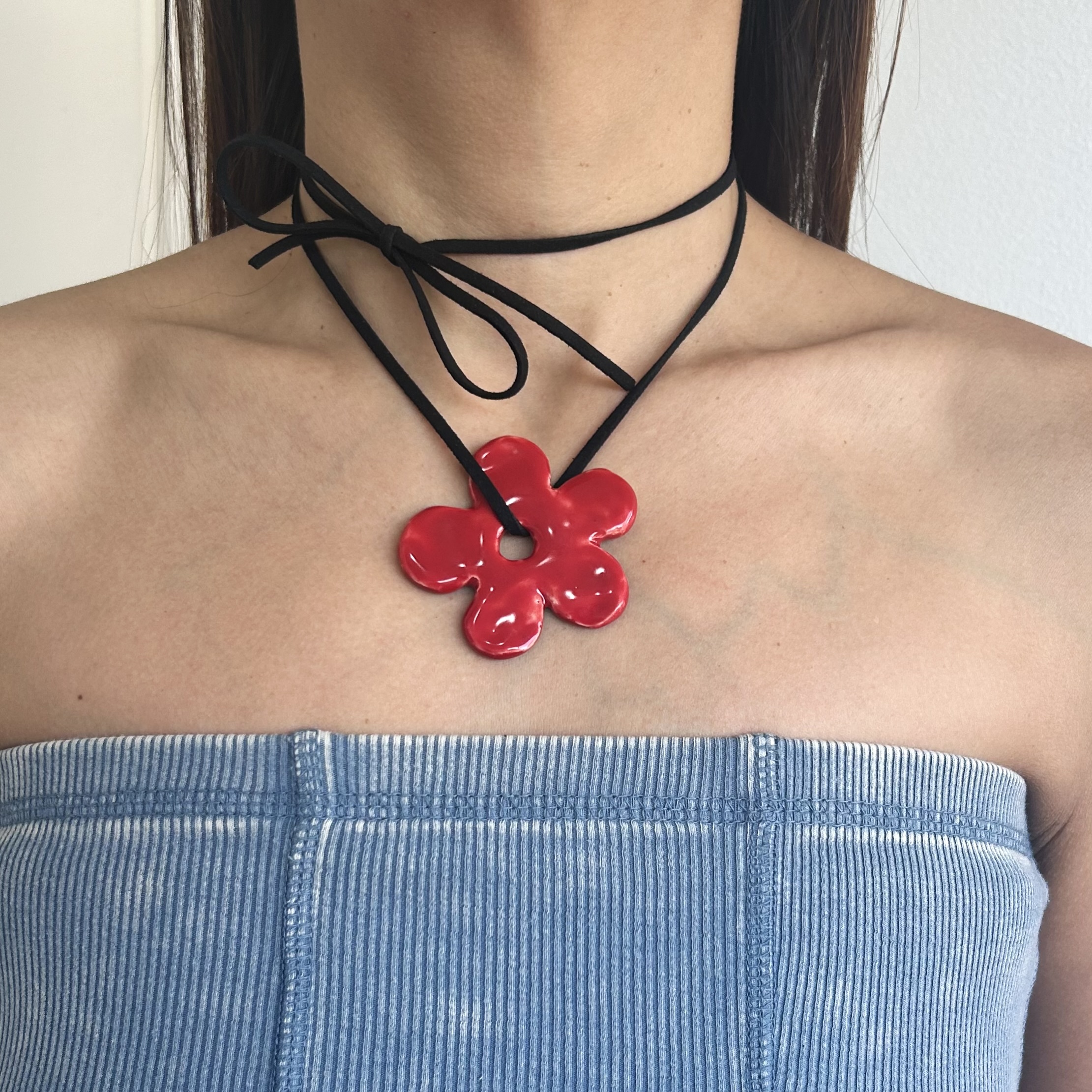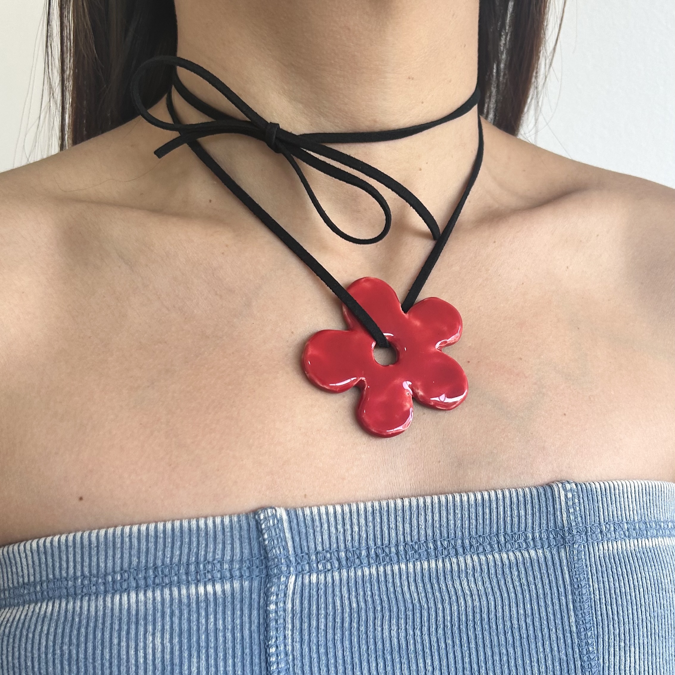 Collar de la colección de verano, la flor es de cerámica hecha a mano, el tiento es de gamuza.