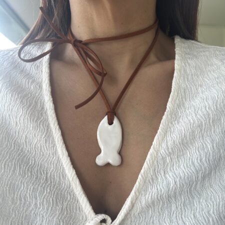 Collar de la colección de verano, el pez es de cerámica hecha a mano, el tiento es de gamuza.