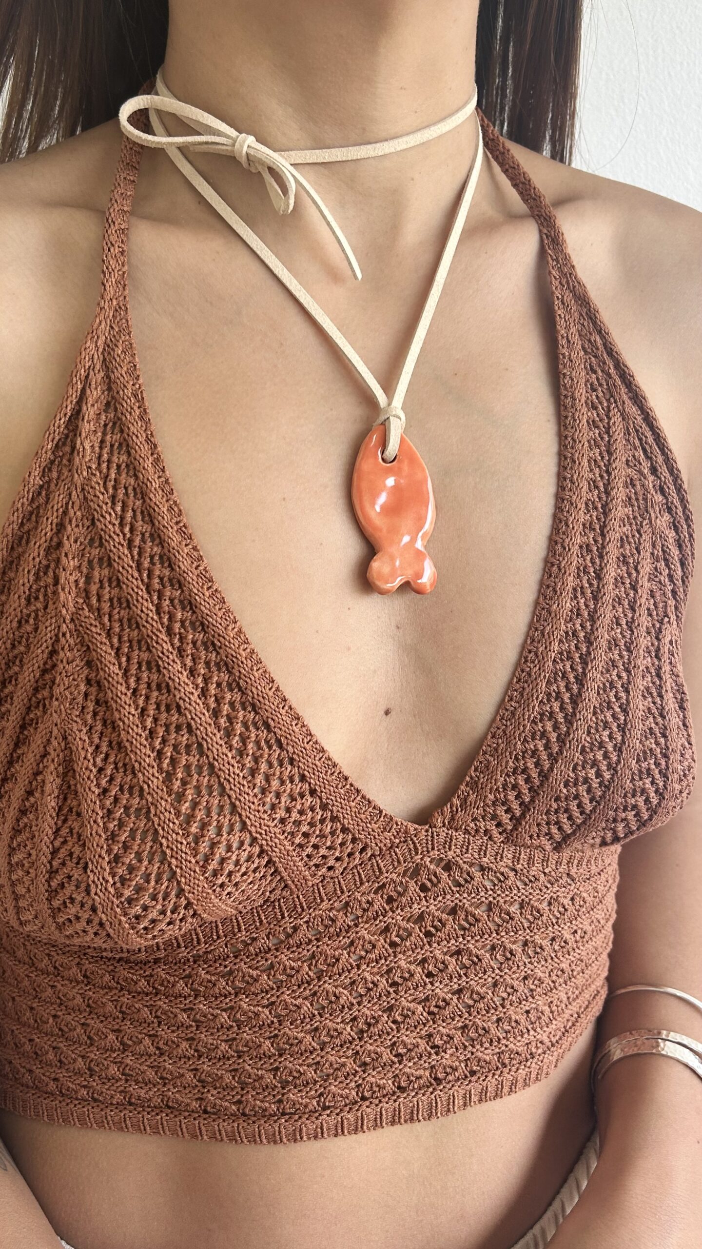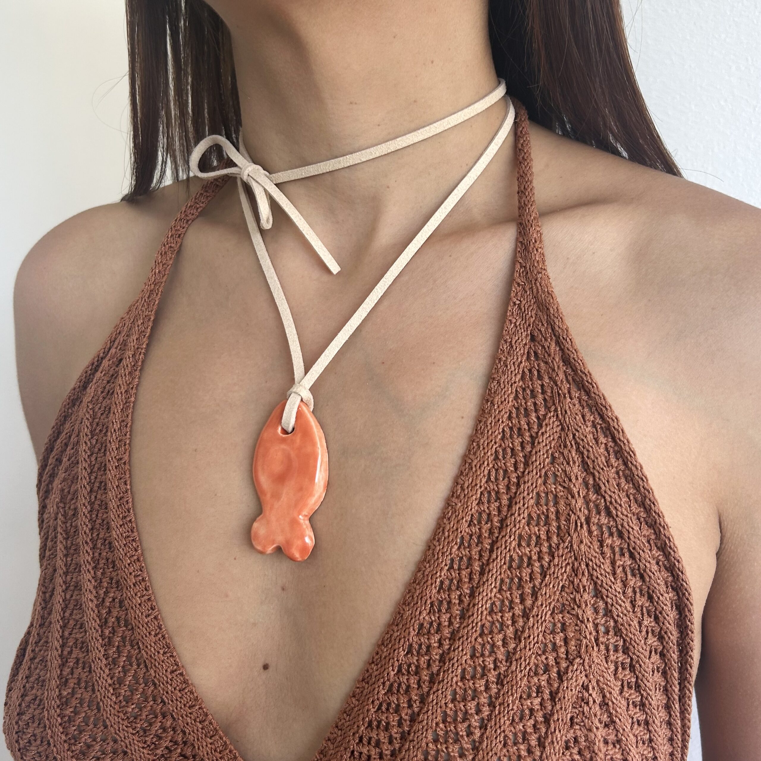 Collar de la colección de verano, el pez es de cerámica hecha a mano, el tiento es de gamuza.