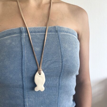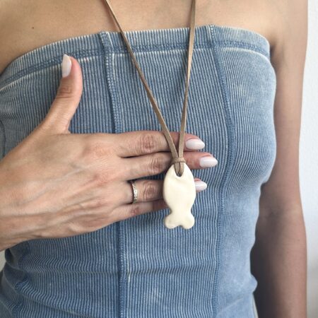Collar de la colección de verano, el pez es de cerámica hecha a mano, el tiento es de gamuza.