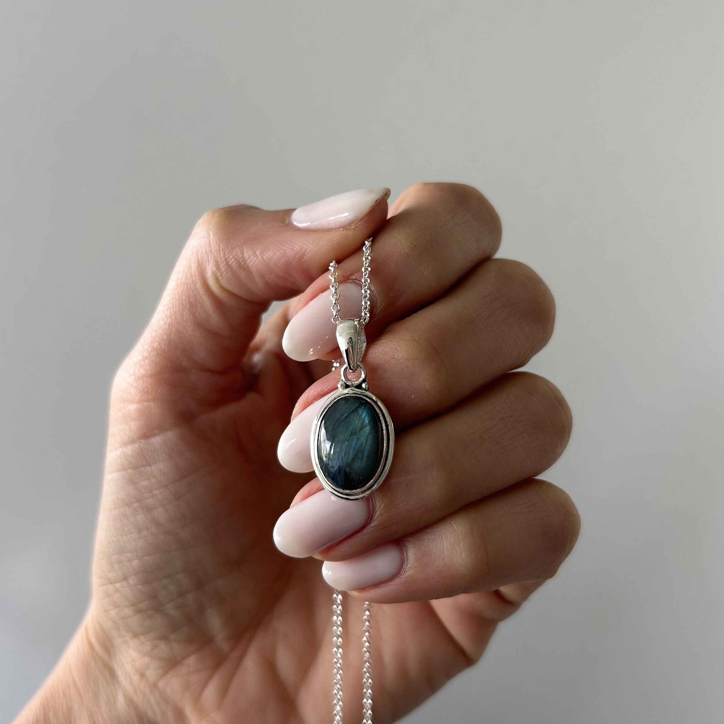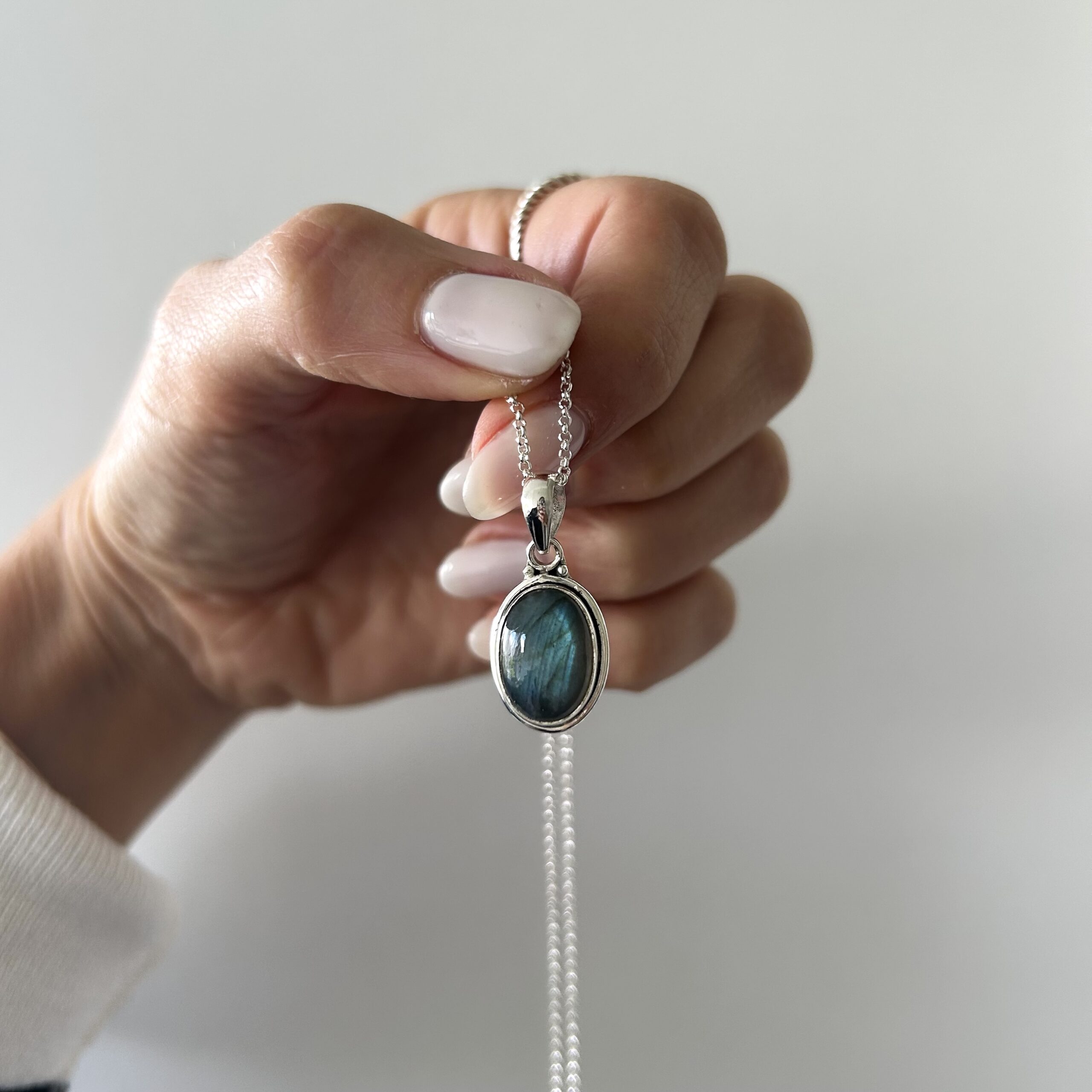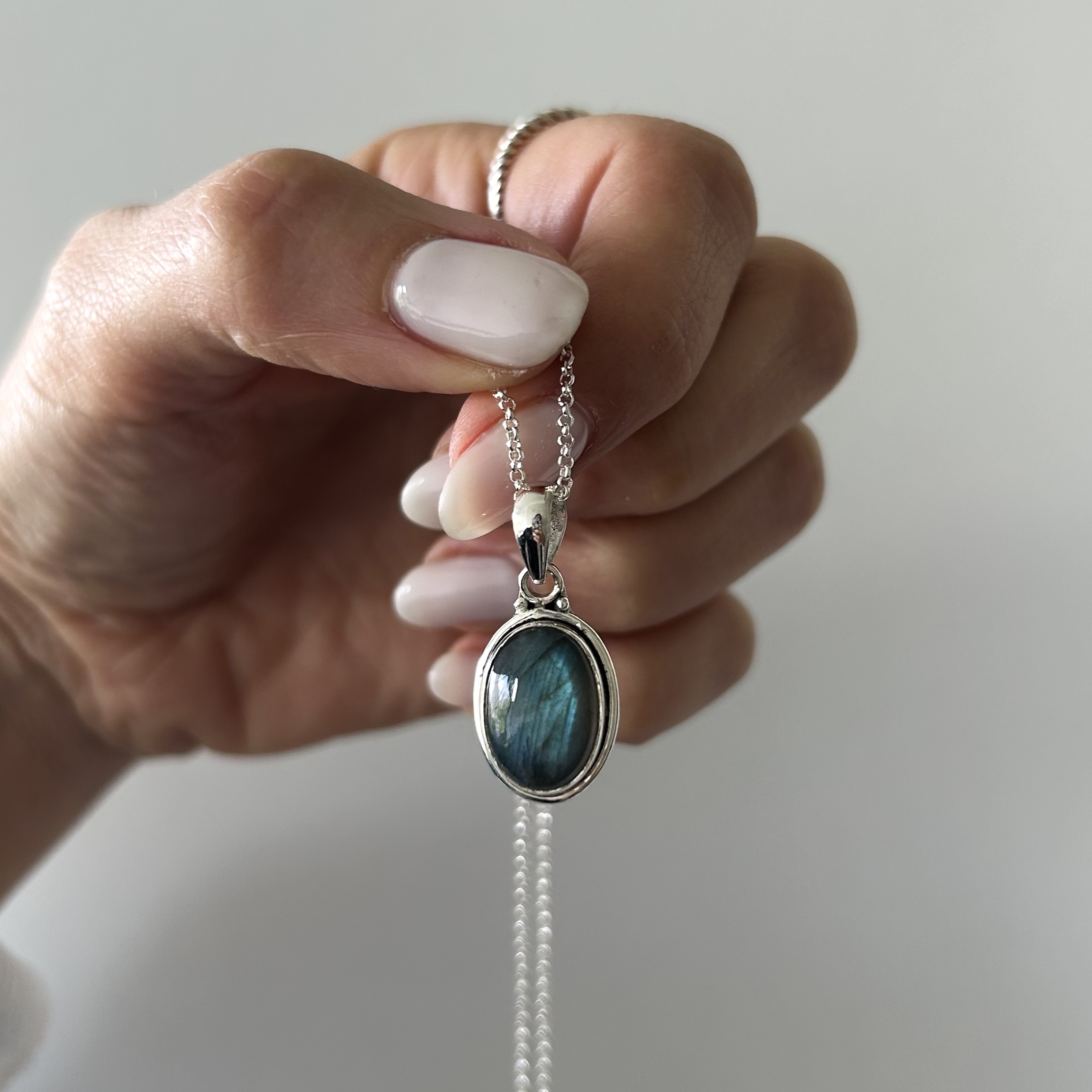 Conjunto con piedra natural labradorita (tamaño del dije 1,8 x 1,3 cm más contra argolla)