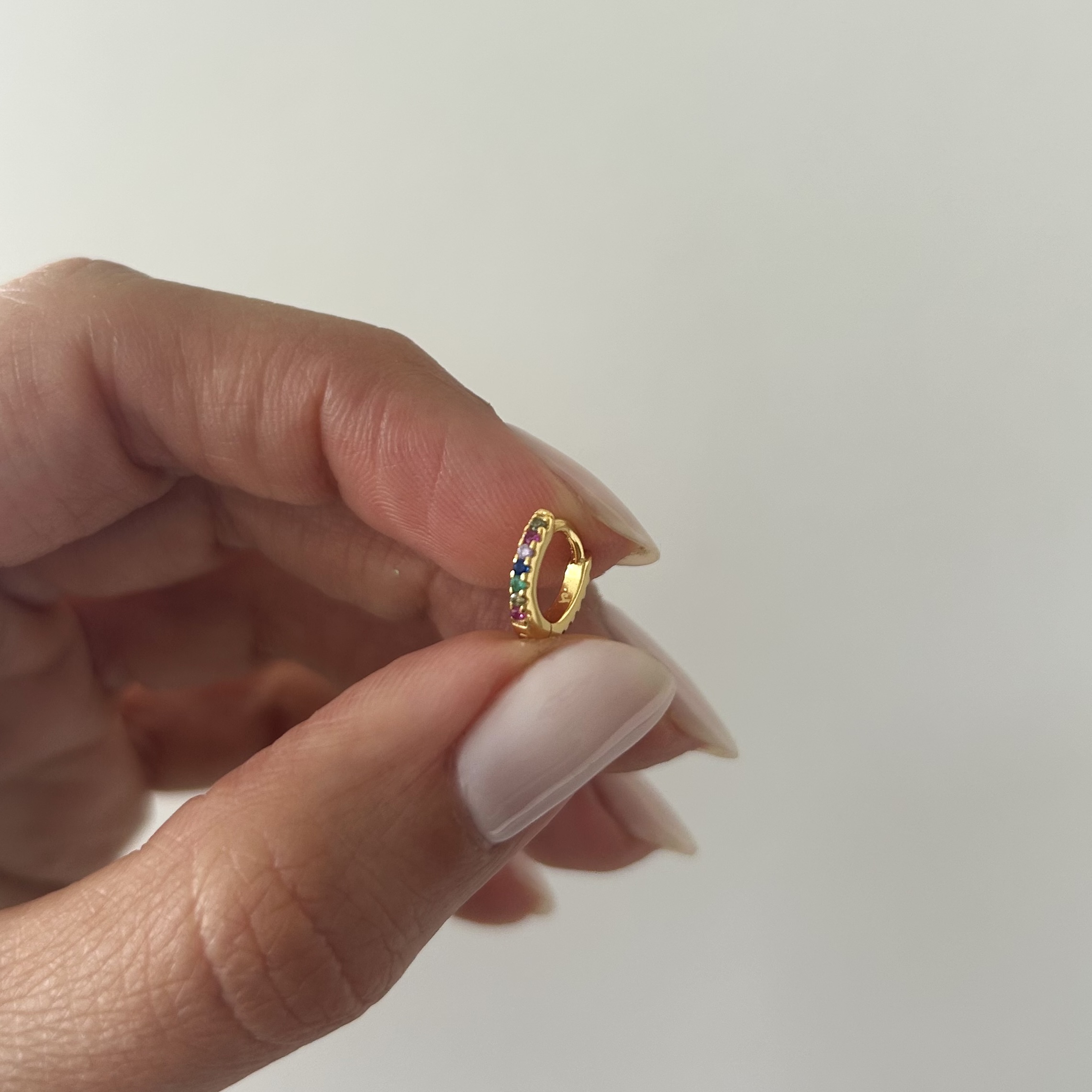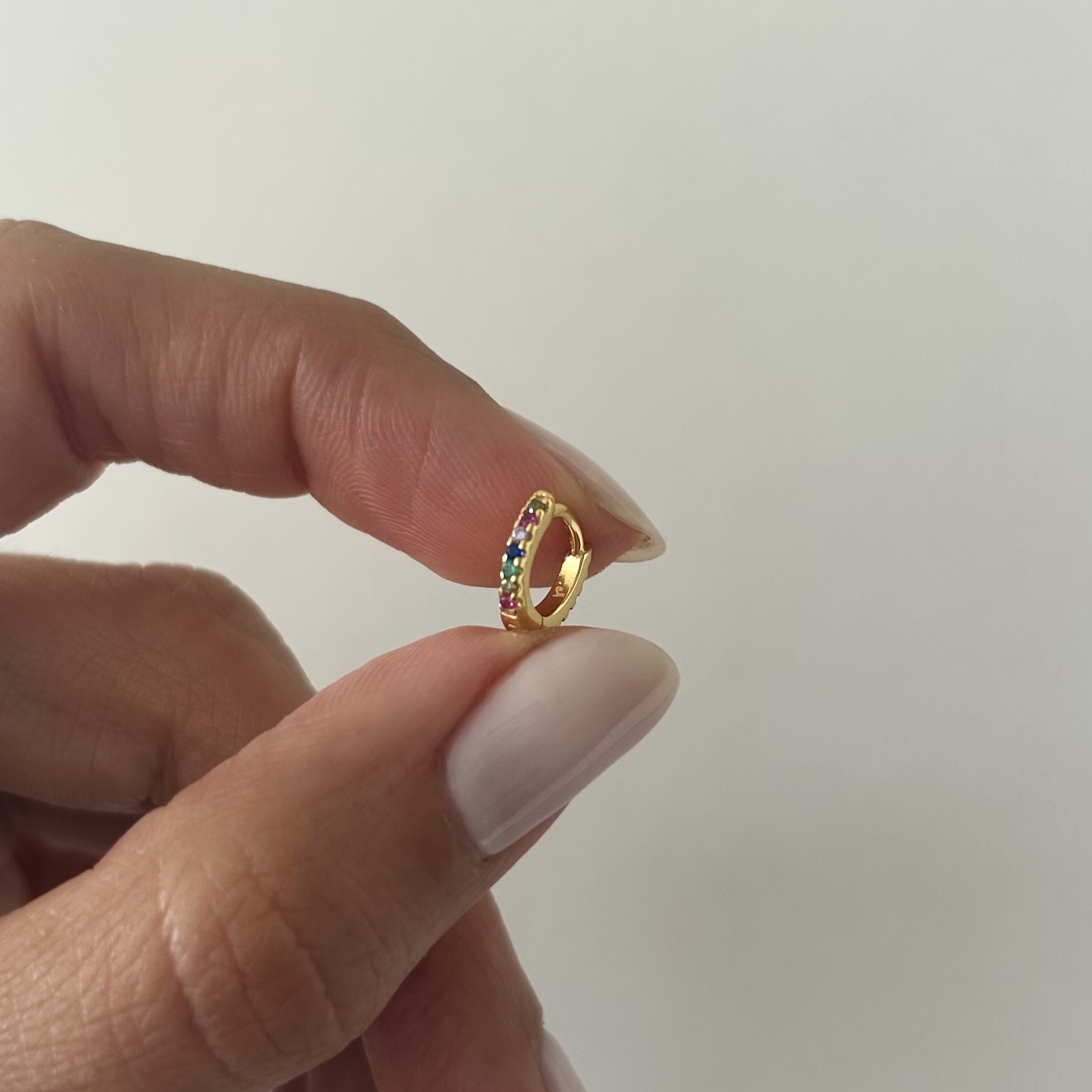 Mini arito con cierre Huggie y ciconias de colores. Mide 1 cm de diámetro exterior.