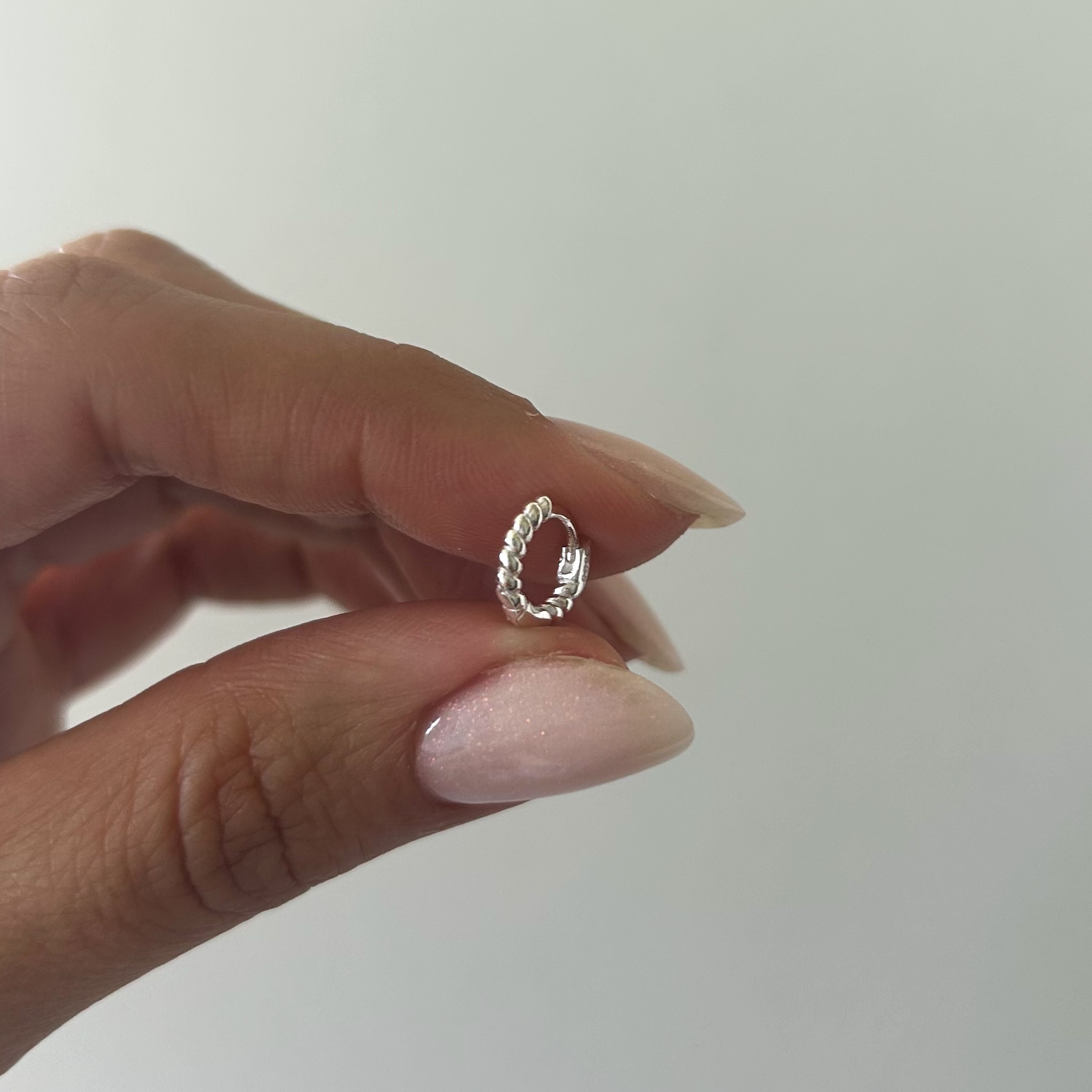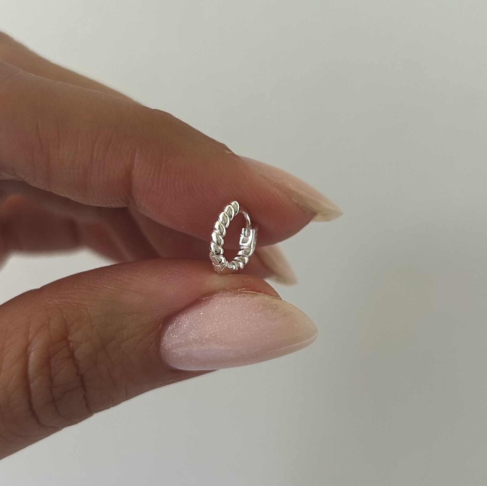 Mini arito torneado con cierre huggie, mide 1 cm de diámetro exterior.