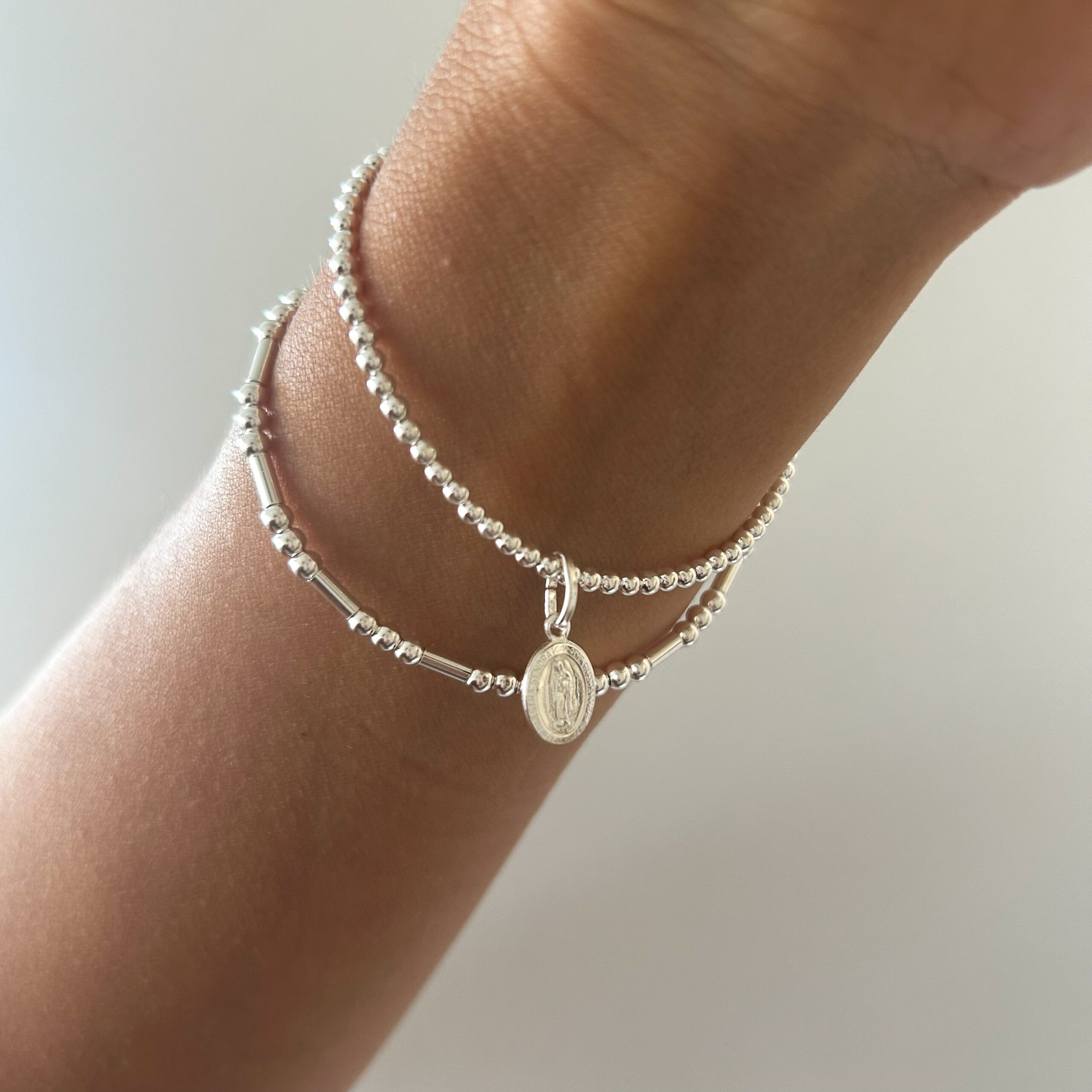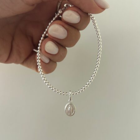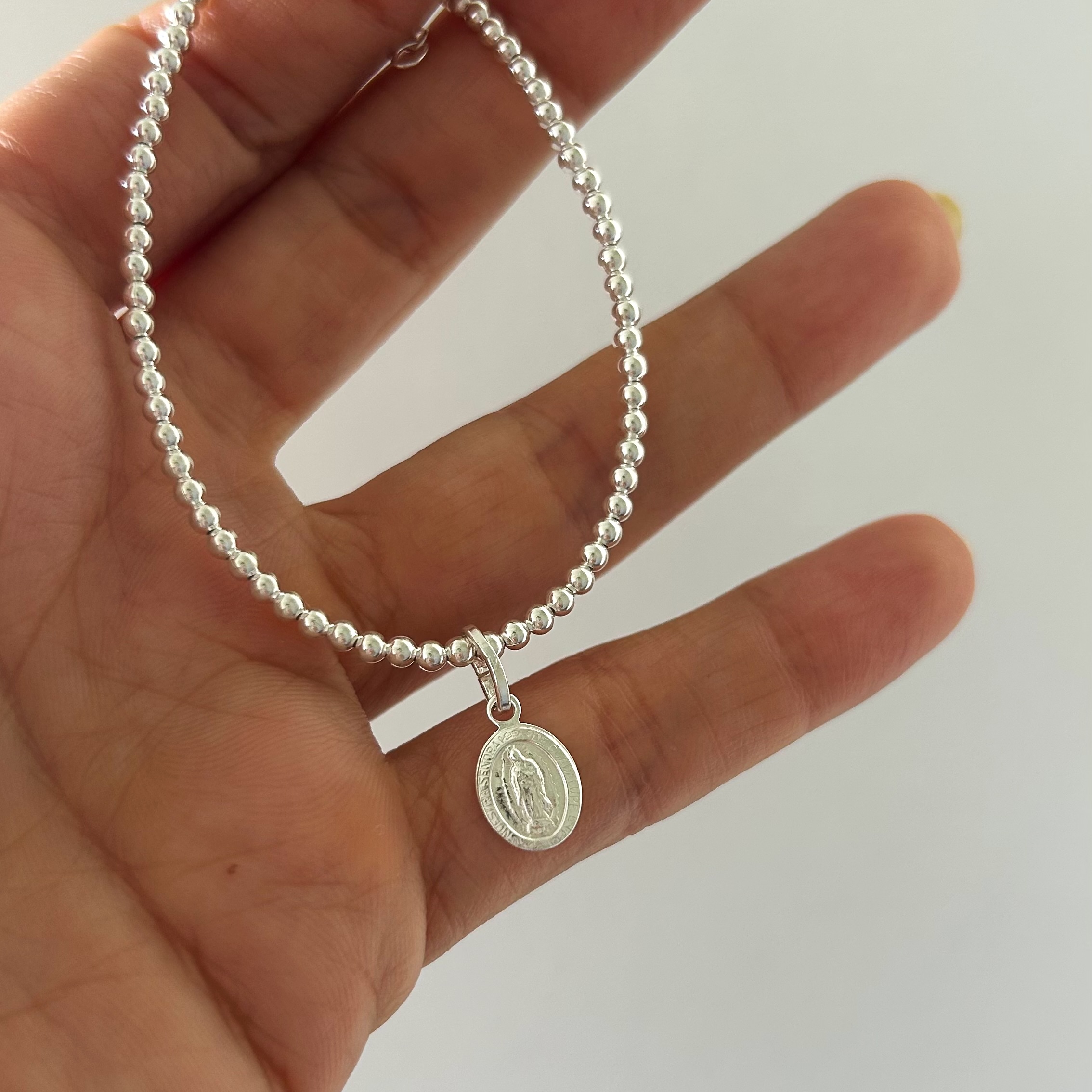 Pulsera con bolitas (tiene extensor para regular el largo) con medallita de la virgen de  Guadalupe.