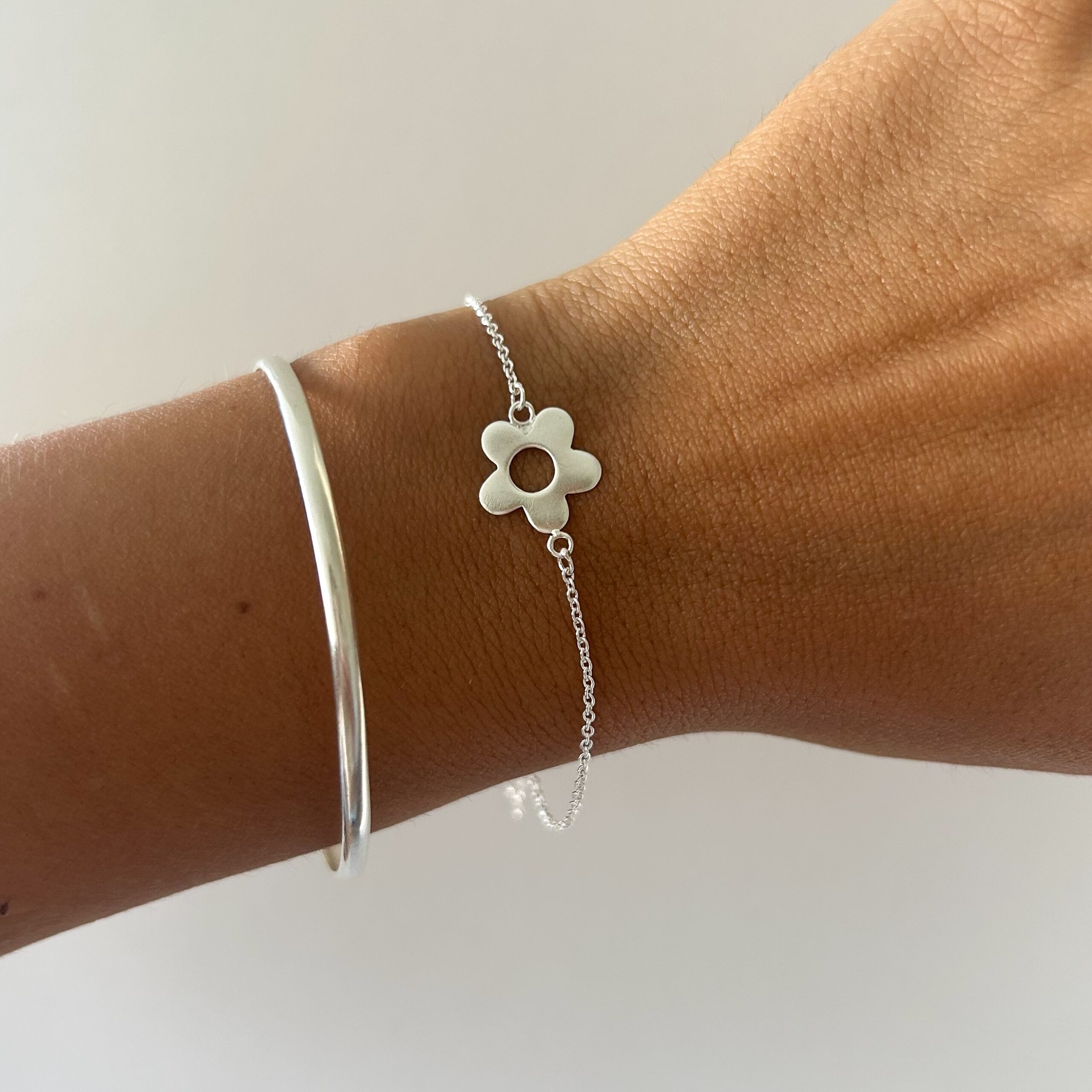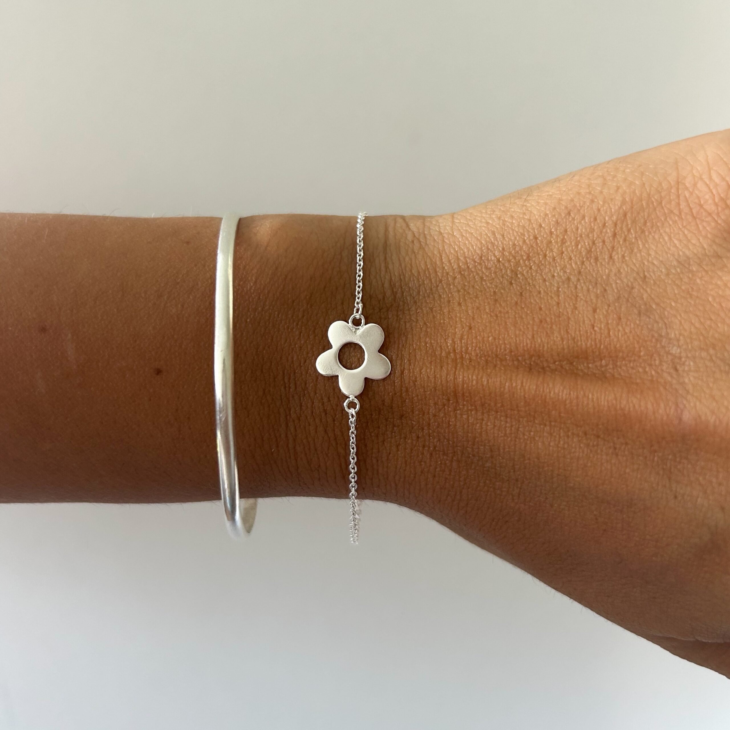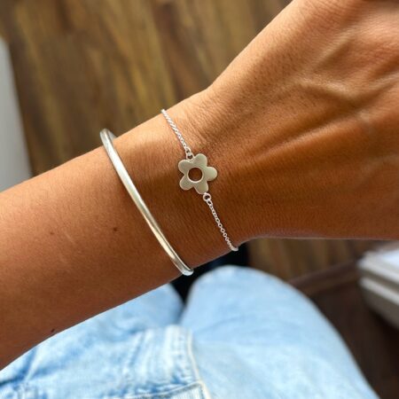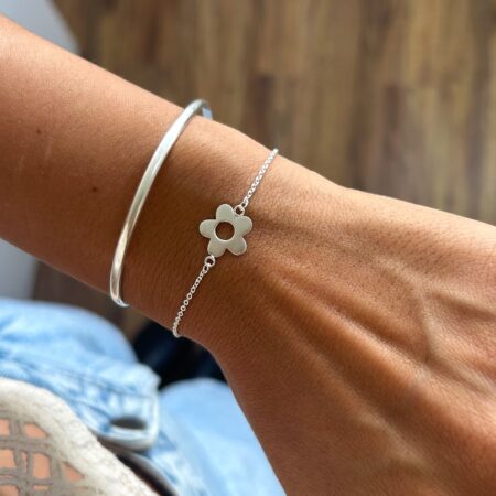 Pulsera con dije central flor, mide 16 cm de largo + 3 cm de extensor.